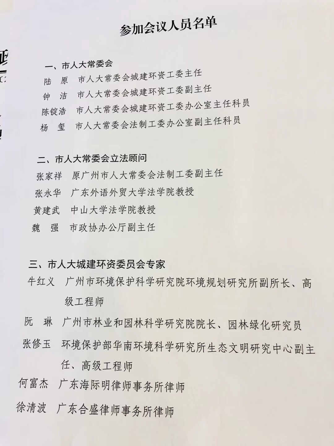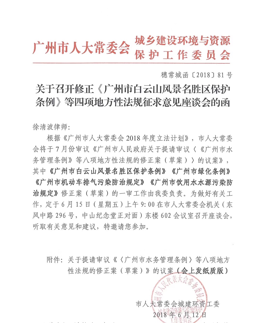 2018年6月15日,徐清波律师接受广州市人大常委会城乡建设环境与资源保护工作委员会邀请,参与《广州市白云山风景名胜区保护条例》《广州市绿化条例》《广州市机动车排气污染防治规定》《广州市饮用水水源污染防治规定》修正案(草案)征求意见座谈会。
